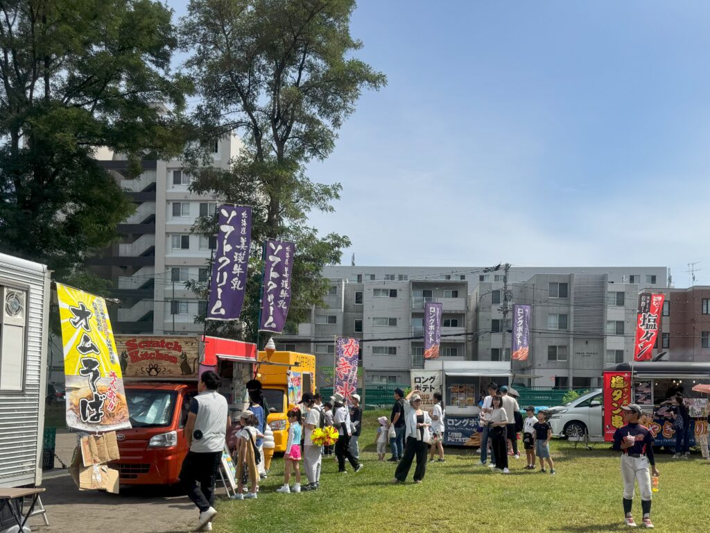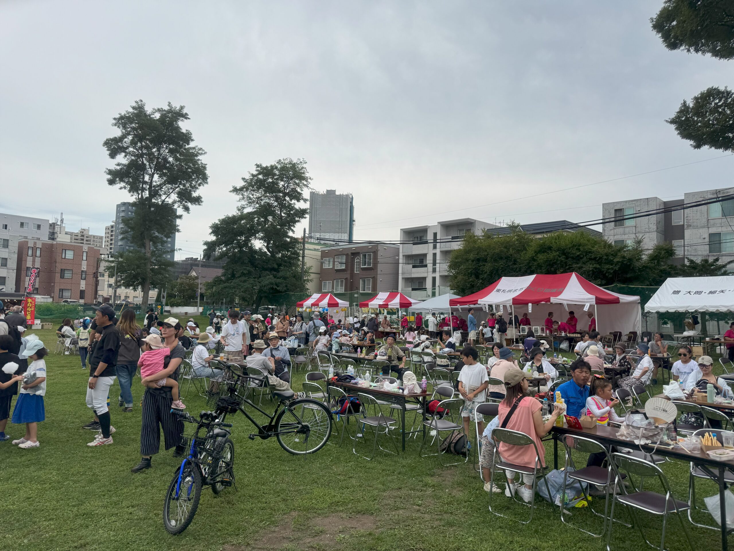 また、会場内には焼きそば、焼き鳥、ロングポテト、たこ焼き、ソフトクリームなどのキッチンカーや町内会の模擬店が並び、枝豆や冷たい飲み物を片手にくつろぎながら、地域の方々との交流を楽しむ様子があちこちで見られ、地域色豊かな催しとなりました。